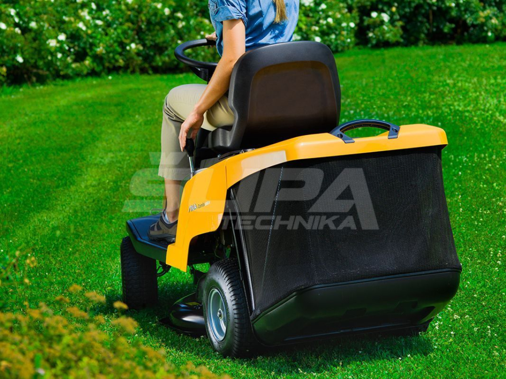Efektívny zber: Pokosenú trávu zbiera do 150-litrového koša, ktorý sa vysýpa mechanicky priamo zo sedadla vodiča.